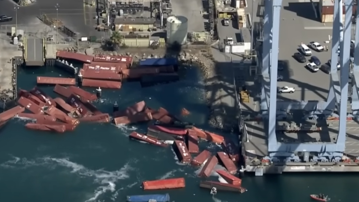 Not uncommon for a container to fall off in rough seas, but this happened while ship was docked in Long Beach
