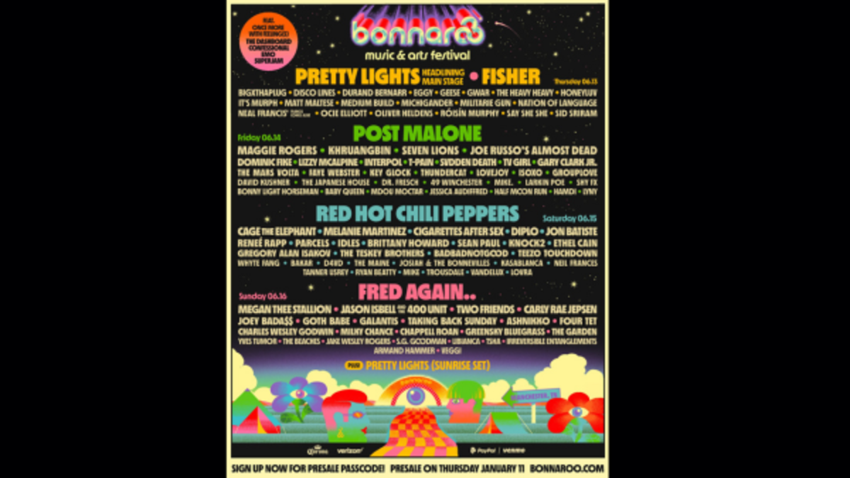 Bonnaroo 2024 Red Hot Chili Peppers, Post Malone, Fred Again.., Pretty Lights, Megan Thee Stallion, Cage The Elephant and more! Manchester TN, June 13th-16h For more information and to purchase tickets CLICK HERE