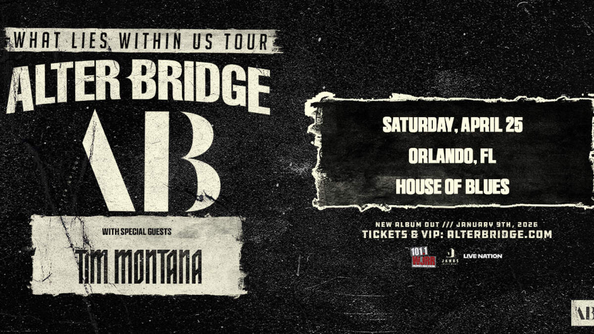 Alter Bridge - What Lies Within Tour presented by 101.1 WJRR With special guests Tim Montana Saturday, April 25 | House of Blues Orlando | 6:00PM Purchase tickets HERE